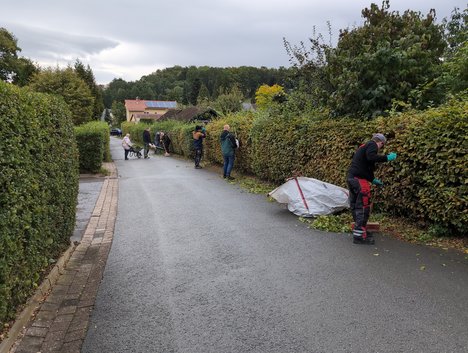 Leider hatte die Wetterprognose für den 10.09. Regen angezeigt, so das entschieden wurde, den Ausweichtermin am 17.09. zu nutzen. Die Arbeit startete nach kurzer Begrüßung und Einteilung der Anwesenden gegen 10:00 Uhr. Die Aussenhecke stand wieder im Fokus. Der Efeu am Toilettenhaus und Garage wurde zurückgeschnitten und ein brachliegender Garten "aufgemöbelt". Diesmal wurde der Grünschnitt in großen Säcken gesammelt und anschließend weggefahren. Das Angebot von Fachberater Matthias sich die Obstbäume in den Gärten anzusehen und Tipps zum Baumschnitt zu geben, wurde auch gut angenommen.