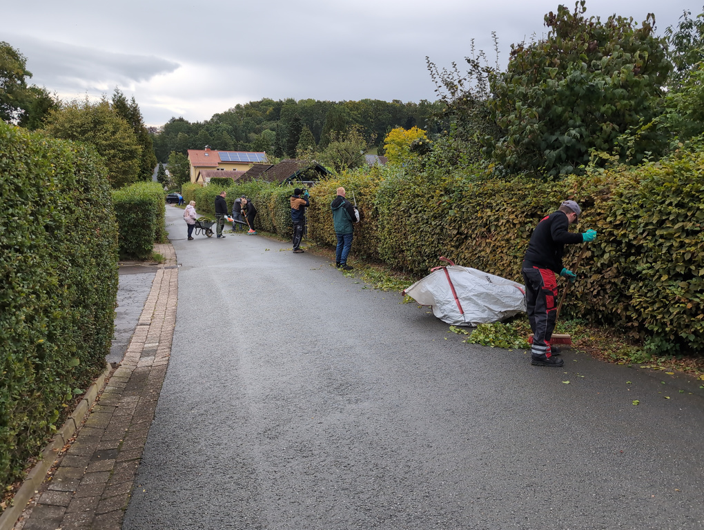 Ein gutes Ergebnis stand am Ende eines arbeitsreichen Vormittags. Alle Vorhaben konnten erledigt werden. Besonders erfreulich war die Teilnehmerzahl. Es gab keine unentschuldigten Ausfälle. Zu Beginn wurden die Biergartengarnituren aufgebaut und die Arbeiten verteilt. Die bewährten Teams fanden sich zusammen und die neuen Mitglieder*innen wurden problemlos integriert. Die neuen Akku-Heckenscheren kamen zum Einsatz und erleichterten die Arbeit an der Hecke. Ich habe mich besonders über die Unterstützung beim Aufräumen und Vorbereiten gefreut. Vielen Dank dafür! Der Toilettencontainer wurde zu 90% vom Efeu befreit und hierbei hat insbeonders Gerald richtig rangeklotzt. Die Säcke mit dem Grünschnitt mussten nicht zum Wertstoffhof gefahren werden , da Arne den Grünschnitt als Unterlage für sein Hochbeet gehäckselt hat. Am Ende der Gemeinschaftsarbeit wurde noch gemeinsam gegessen. Peter hatte auch noch einen selbstgemachten Kuchen mitgebracht. Wir haben eine Weile zusammengesessen und es wurden schon erste Ideen für das Jubiläum im nächsten Jahr ausgetauscht. Danke an Helga und Uschi für die Vorbereitung.